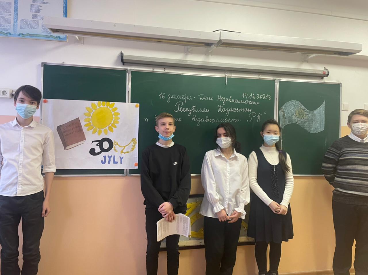 Сегодня учительница по математике Гултораева Нигина Хамидуллаевна провела классный час на тему «30- летие Независимости Республики Казахстана».В 8-«Д» классе ученики активно участвовали в мероприятии и Пак Мария спела стих «Мой Казахстан».