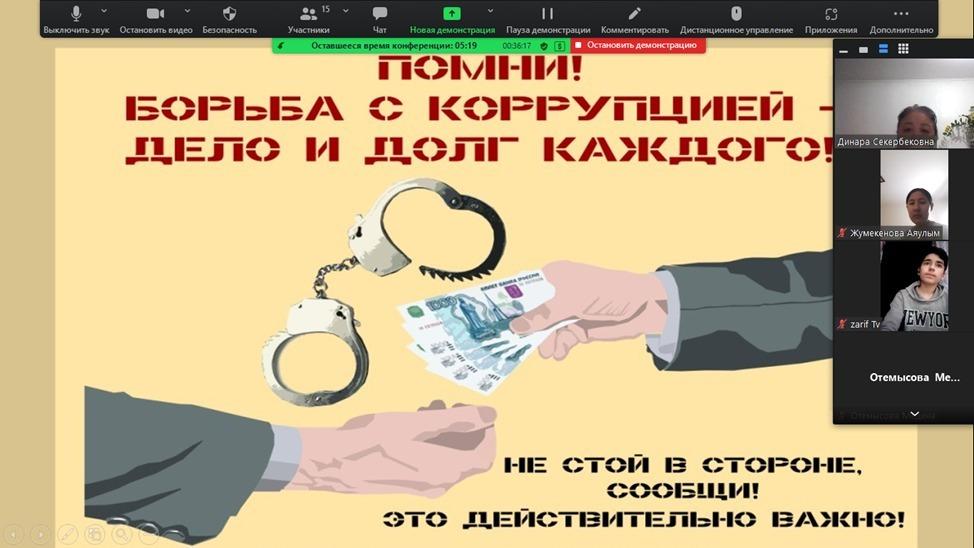 Ә.Шәріпов ат.№16 ЖББМ КММ де –ZOOM платформасы арқылы «Адал ұрпақ» ерікті мектеп клубының ұйымдастыруымен «Жемқорлықсыз әлем» тақырыбында отырыс болып өтті. Мақсаты: оқушыларды адал жолмен жүруге, адалдыққа үйрету. Сыбайлас жемқорлық туралы қысқаша мағұлматтар беру. Өз мемлекетіне жауапкершілікпен қарау және әділдікке тәрбиелеу. Отырыс барысында жемқорлықтың ел болашағына тигізетін зардаптарын талқылап, жемқорлықпен күресу жолдары жөнінде өз ойларын ортаға салды.