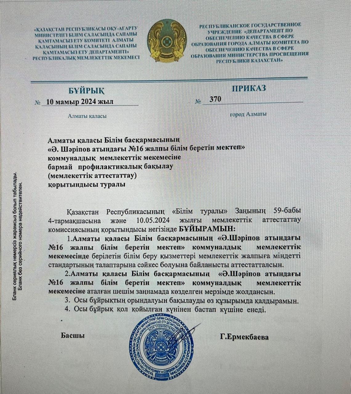 КГУ «Общеобразовательная школа №16 имени А.Шарипова»