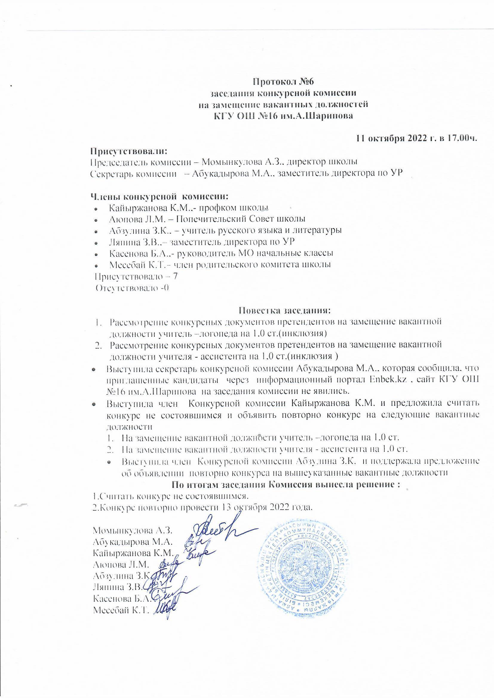 11 октябрь 2022 0 1 2 3 4 5 Протокол №6 заседания конкурсной комиссии на замещение вакантных должностей КГУ ОШ №16 им. А.Шарипова Осы беттің QR-коды:QR-код этой страницы: