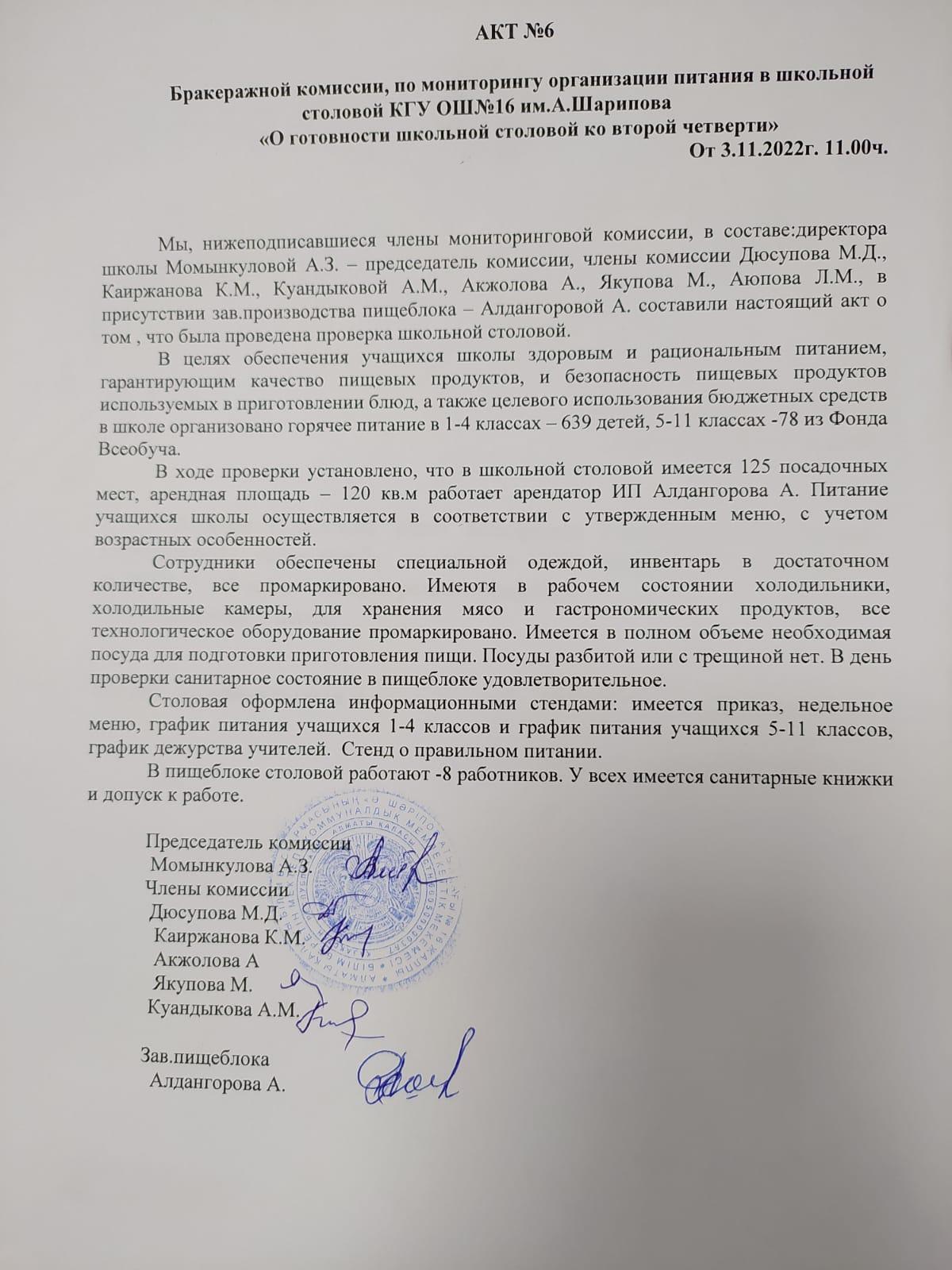03 ноябрь 2022 0 1 2 3 4 5 АКТ №6 Бракеражной комиссии, по мониторингу организации питания в школьной столовой КГУ ОШ№16 им. А.Шарипова Осы беттің QR-коды:QR-код этой страницы: