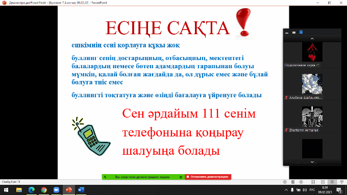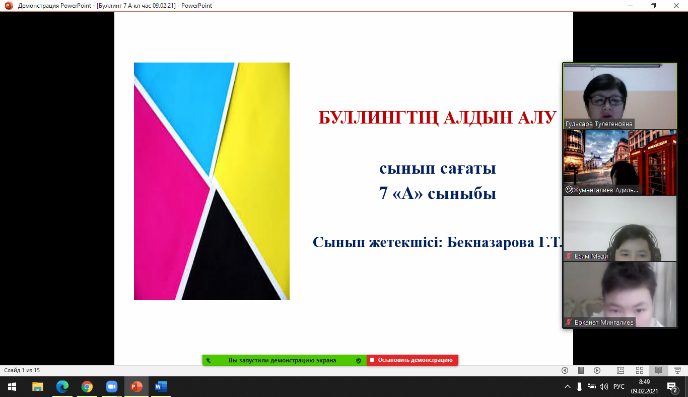 Дүниежүзілік Балалар күніне арналған «Бала құқығы – адам құқығы» республикалық айлық аясында Ә.Шәріпов ат.№16 жалпы білім беретін мектебінде «Буллингтің алдын алу» тақырыбында 7 сынып оқушыларымен сыныптан тыс ашық өткізілді. Мақсаты: жасөспірімдер арасындағы буллингтің өзектілігін, ұғымдардың мәнін ашу; буллингтің экожүйесі, факторлары, түрлерін көрсету; буллинг жағдаяттарын талдау;