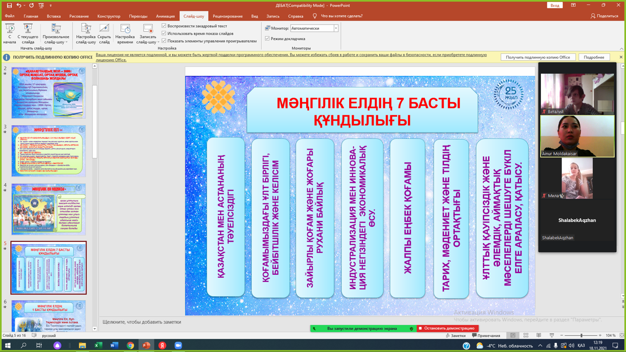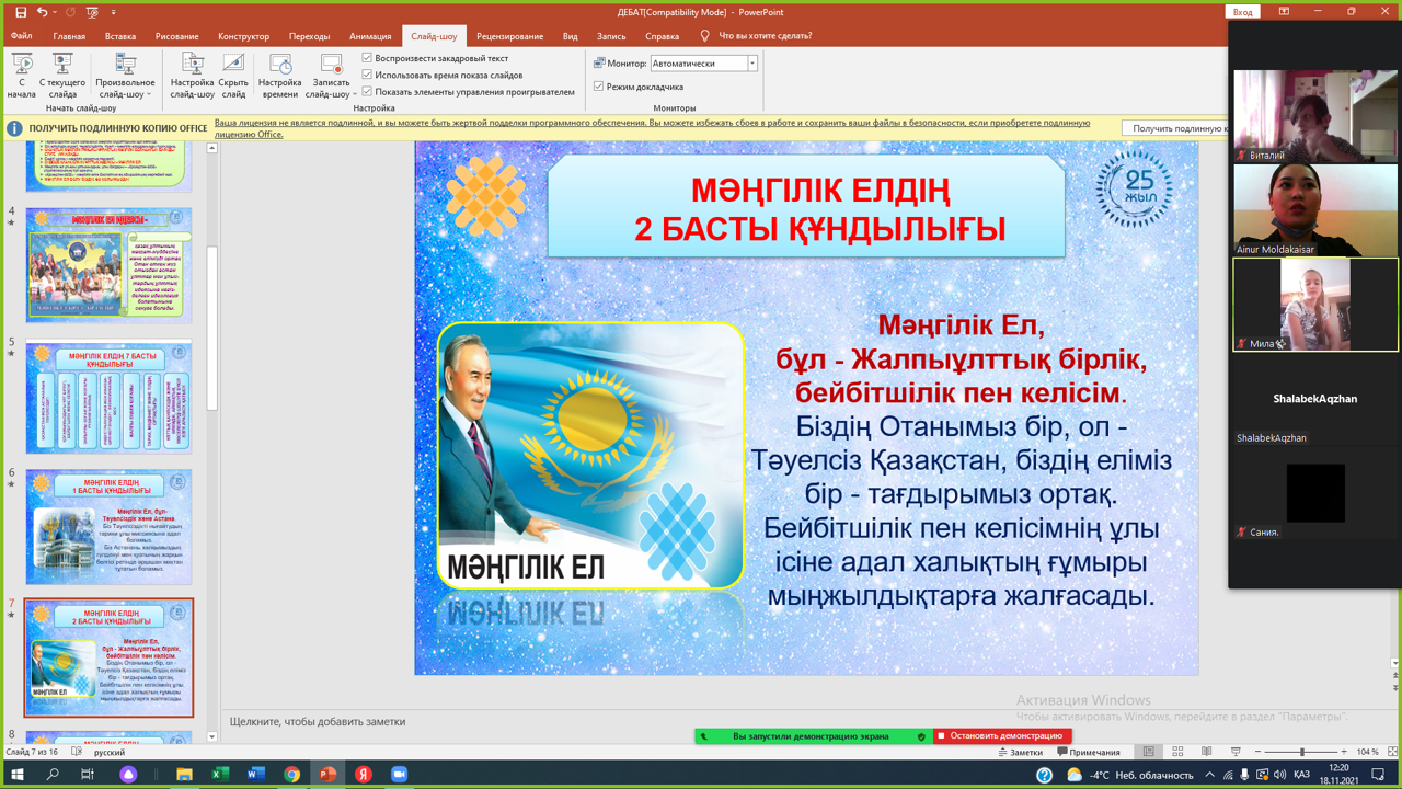 Ә.Шәріпов ат.№16 ЖББМ КММ де –Тәрбие жұмысының «Ұлттық тәрбие» бағытындағы «Өнегелі бір сағат» жобасы аясында ZOOM платформасы арқылы «Біз Шәріпшілер» пікір – сайыс клубының ұйымдастыруымен «Мәңгілік елдің 7 мызғымас негізі» тақырыбында дебат сайысы өтті. Мақсаты: Оқушыларға «Қазақстан 2050» стратегиясының маңызы мен мақсатын түсіндіру арқылы «Мәңгілік Ел» идеясының маңызын түсіну, Отанын сүюге, бірлікке, ел тарихын білуге, еліміздің өркендеуіне үлес қосуға тәрбиелеу. Дебат барысында тақырыпқа сай «Мәңгілік Ел» идеясының жастарға арналған бағдарламаларының мақсаты мен міндеттерін түсіне отырып, тиімді және тиімсіз жақтарын қарастырып, өз пікірлерін ортаға салды.