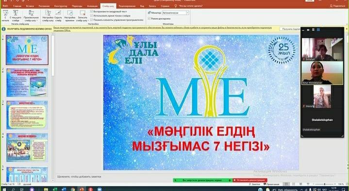 Мектебімізде тәрбие жұмысының «Ұлттық тәрбие» бағытындағы «Өнегелі бір сағат» жобасы аясында ZOOM платформасы арқылы «Біз Шәріпшілер» пікір – сайыс клубының ұйымдастыруымен «Мәңгілік елдің 7 мызғымас негізі» тақырыбында дебат сайысы өтті. Мақсаты: Оқушыларға «Қазақстан 2050» стратегиясының маңызы мен мақсатын түсіндіру арқылы «Мәңгілік Ел» идеясының маңызын түсіну, Отанын сүюге, бірлікке, ел тарихын білуге, еліміздің өркендеуіне үлес қосуға тәрбиелеу. Дебат барысында тақырыпқа сай «Мәңгілік Ел» идеясының жастарға арналған бағдарламаларының мақсаты мен міндеттерін түсіне отырып, тиімді және тиімсіз жақтарын қарастырып, өз пікірлерін ортаға салды.