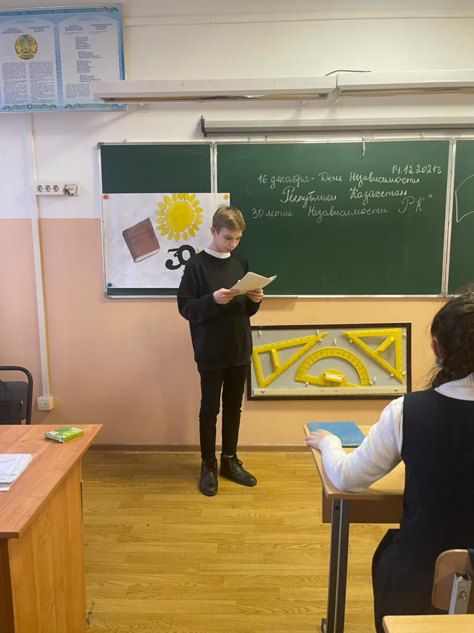 Сегодня учительница по математике Гултораева Нигина Хамидуллаевна провела классный час на тему «30- летие Независимости Республики Казахстана».В 8-«Д» классе ученики активно участвовали в мероприятии и Пак Мария спела стих «Мой Казахстан».