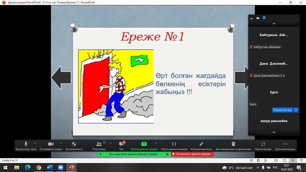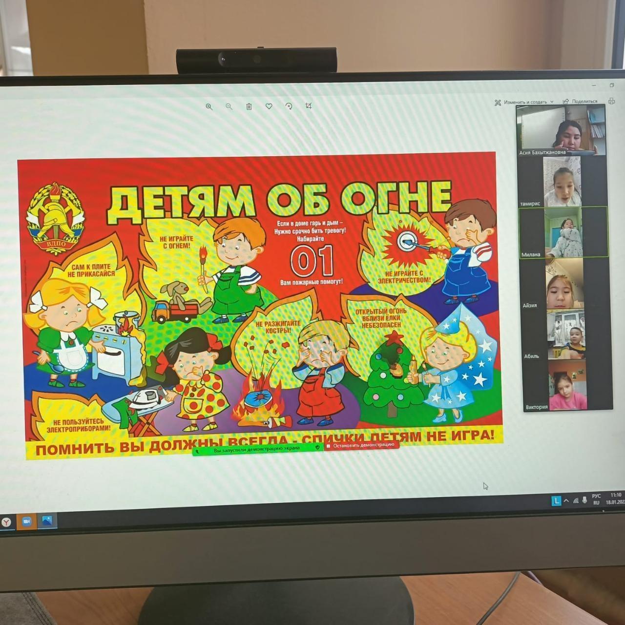 Ә.Шәріпов ат.№16 ЖББМ КММ де – ZOOM платформасы арқылы онлайн 8 – 11 сынып оқушылары арасында «Өрттің салдары» тақырыбында сынып сағаты өтті. Мақсаты: Оқушыларға өрт қауіпсіздігі ережесін жетік білудің маңызын ұғындыру. Өзін - өзі қорғауға, қоршаған ортаны қорғауға және өрт болған жағдайдағы қарапайым ережелерді үйрету. Сынып сағатында оқушылар өрт сөндіру техникалары мен құраладарымен танысты. Және өрттің алып келетеін салдарларын талқылап, өрт болған жағдайда жасалатын алғашқы шаралар жөнінде сөз қозғады.