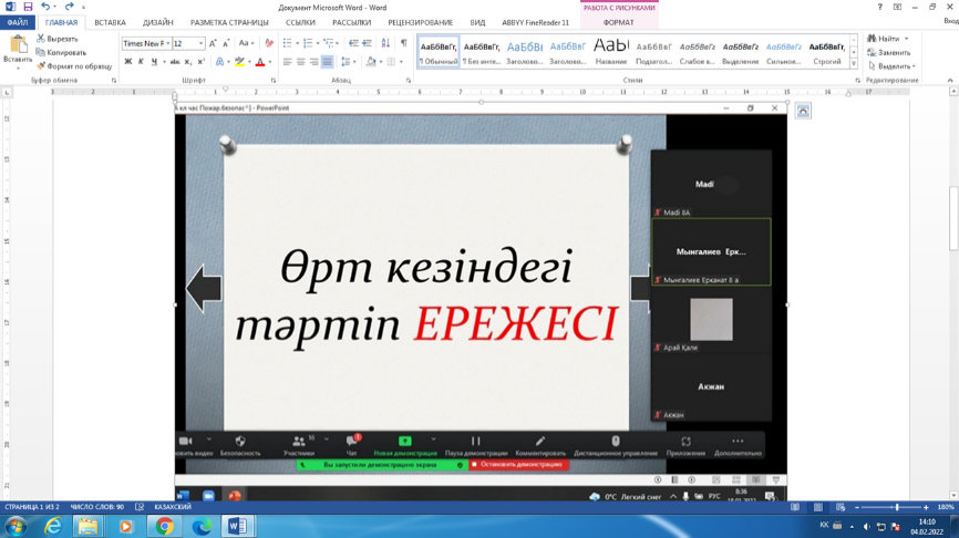 Ә.Шәріпов ат.№16 ЖББМ КММ де – ZOOM платформасы арқылы онлайн 5 – 7 сынып оқушылары арасында «Өрттің пайда болу себептері» тақырыбында тәрбие сағаты өтті. Мақсаты: өрттің шығу себептерімен таныстыру; экстремалды жағдайда өзін дұрыс ұстауды және жылдам әрекет етуді үйрету. Тәрбие сағаты барсында өрттің пайда болу себептері мен факторларын қарастырып, өрттің алдын алу шаралары жөнінде сөз қозғалды.