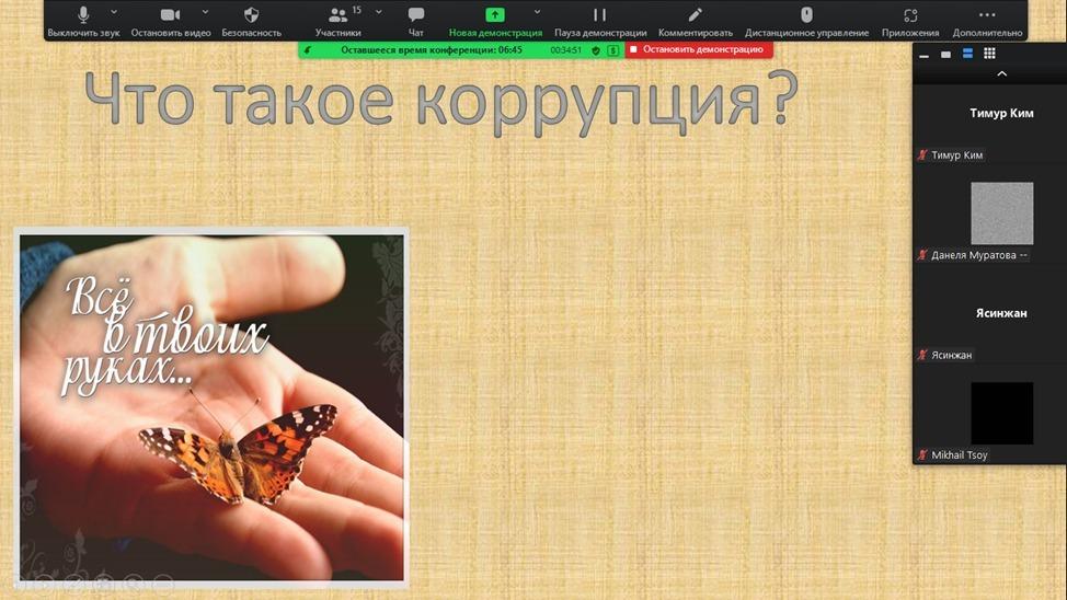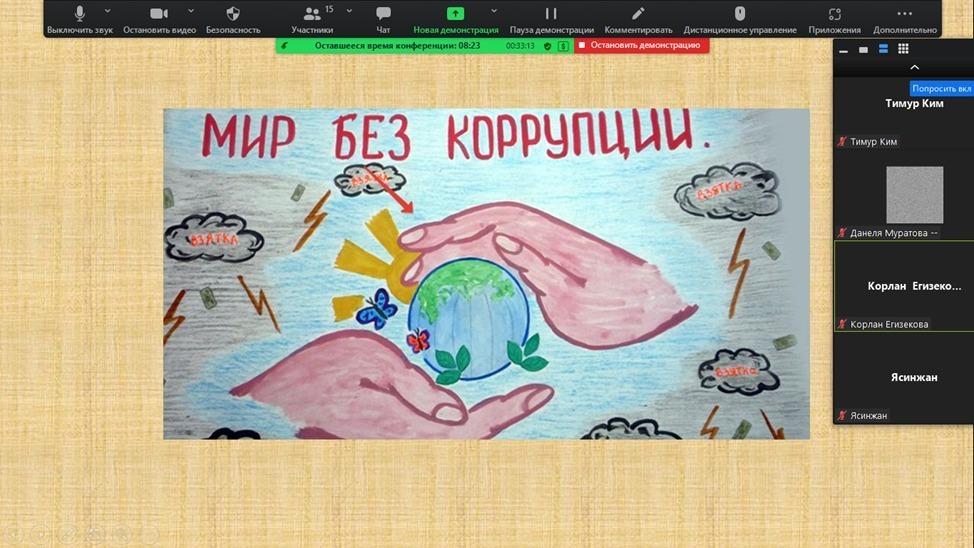 Ә.Шәріпов ат.№16 ЖББМ КММ де –ZOOM платформасы арқылы «Адал ұрпақ» ерікті мектеп клубының ұйымдастыруымен «Жемқорлықсыз әлем» тақырыбында отырыс болып өтті. Мақсаты: оқушыларды адал жолмен жүруге, адалдыққа үйрету. Сыбайлас жемқорлық туралы қысқаша мағұлматтар беру. Өз мемлекетіне жауапкершілікпен қарау және әділдікке тәрбиелеу. Отырыс барысында жемқорлықтың ел болашағына тигізетін зардаптарын талқылап, жемқорлықпен күресу жолдары жөнінде өз ойларын ортаға салды.