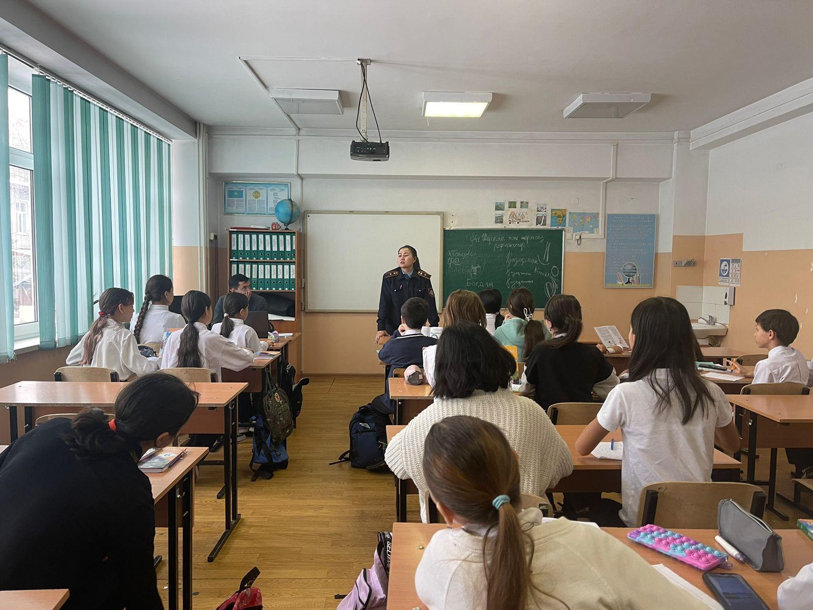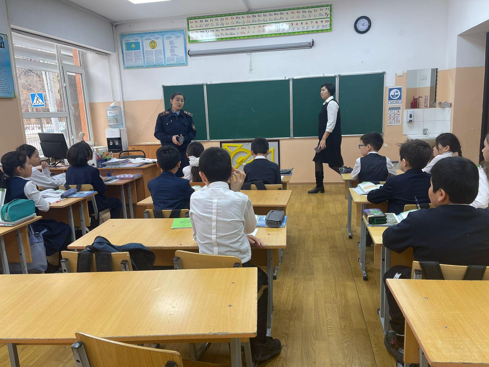 Кәмелет жасқа толмаған жасөспірімдер арасындағы құқық бұзушылықтың алдын алу мақсатында қаңтар айының 10 күні Алмалы аудандық ІІБ полиция майоры Симова Меруерт Онласынқызының қатысуымен 4-5 сынып оқушылары арасында «Кәмелет жасқа толмаған жасөспірімдердің әкімшілік және қылмыстық жауапкершілігі» тақырыбында кездесу ұйымдастырылды. Іс-шараға мектеп психологі Ж.Жанабекқызы, сынып жетекшілер қатысты.