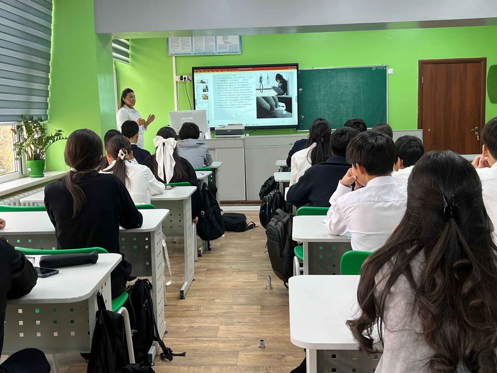 Балаларға қатысты зорлық-зомбылық, суицид деңгейін төмендету және балалардың саламаттылығын қамтамасыз ету мақсатында жүргізілетін іс-шаралардың бірі бүгін 26.11.2025ж Қалалық №5 емхана мамандарымен ұйымдастырылды. Психолог -Турсунбек Сандугаштың қатысуымен 9-11 сынып оқушыларына жан мен тән үйлесімділігі, психологиялық жай-күй туралы сөз қозғалды. Жоғары сынып оқушыларының денсаулықтары мен психологиялық әл-ауқатының маңызы туралы, бұл кезең – болашақ мамандықты таңдау, емтихандар мен жауапкершіліктер көбейетін уақыт, сондықтан стрессті дұрыс басқару өте маңызды екенін айтты. Егер қысым, қобалжу немесе эмоционалдық қиындықтар сезсе, оны ішке жасырып қоймай, жақын адамдарына немесе маманға айту — күштің белгісі деп түсіндірді. Балалардың өз болашақтарын қалыптастырып жатқан ерекше кезеңде екендіктерін айтып, өздеріне күтім жасап, демалыс пен оқуды тең ұстауды ұсынды. Қажет болған жағдайда психологқа жүгіну — дамуларына көмектесетін табиғи, дұрыс қадам екенін айтты. Оқушылар өздеріне қызықты, толғандыратын сауалдарға жауаптар алды.