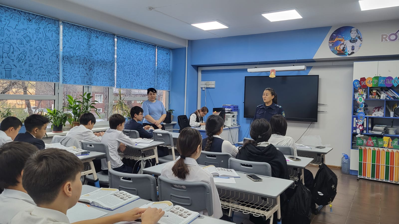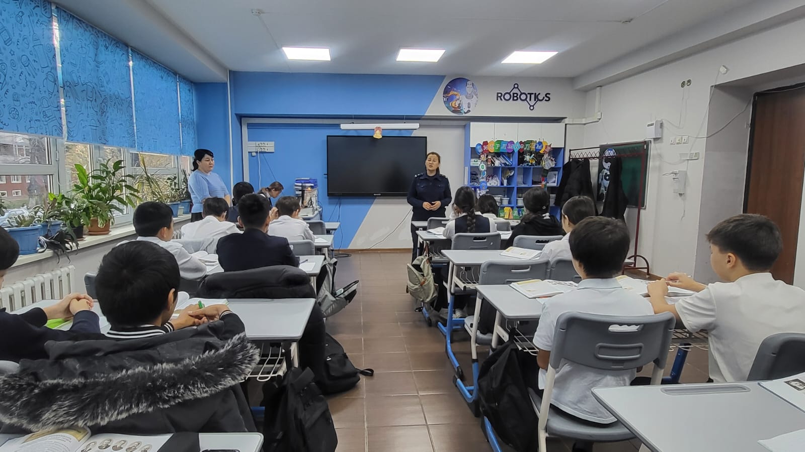 Алмалы аудандық ПБ ЖПҚБ ЮПБ аға инспектор полиция майоры, мектеп инспекторы - Симова Меруерт Оңласынқызы мектеп оқушыларымен кездесу өткізді. Оқушыларға келесі мәліметтер айтылды: кәмелетке толмағандардындар (осы себептердің бірі) үшін есепке алынады: сабақты себепсіз босату, оқудан жалтару, үйден кету, қаңғыбастық, қайыр сұрау – кәмелетке толмағандардың құқықтарына қол сұғатын құқық бұзушылық ретінде сараланады.