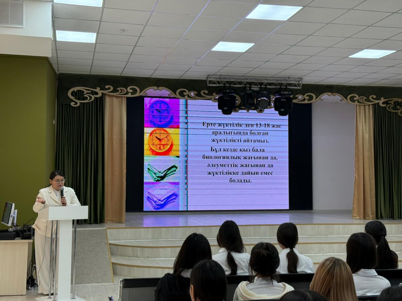 Дәріс барысында Қалалық №5 емханаға қарасты «Жасдәурен» жастар орталығының жалпы тәжірибелік дәрігері Баймолда Арайлым Оңалбайқызы жасөспірімдік кезеңде қыз балалар ағзасында жүретін өзгерістер, етеккір циклінің басталуы мен оның маңызы, осы кезеңдегі тазалық сақтау ережелері, жеке күтім құралдарын дұрыс пайдалану, бойдың өсуі, терлеу ерекшеліктері және теріде болатын өзгерістер туралы жан-жақты ақпарат берді.