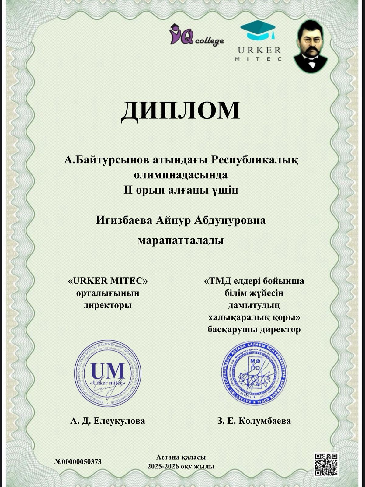 21 октябрь 2025 0 1 2 3 4 5 А.Байтұрсынов атындағы Республикалық олимпиада А.Байтұрсынов атындағы Республикалық олимпиадасында II орын алғаны үшін қазақ тілі мен әдебиеті пәнінің мұғалмі Игизбаева Айнур Абдунуровнаны марапаттымен құттықтаймыз! Сізге шығармашылық табыс тілейміз! Осы беттің QR-коды:QR-код этой страницы: