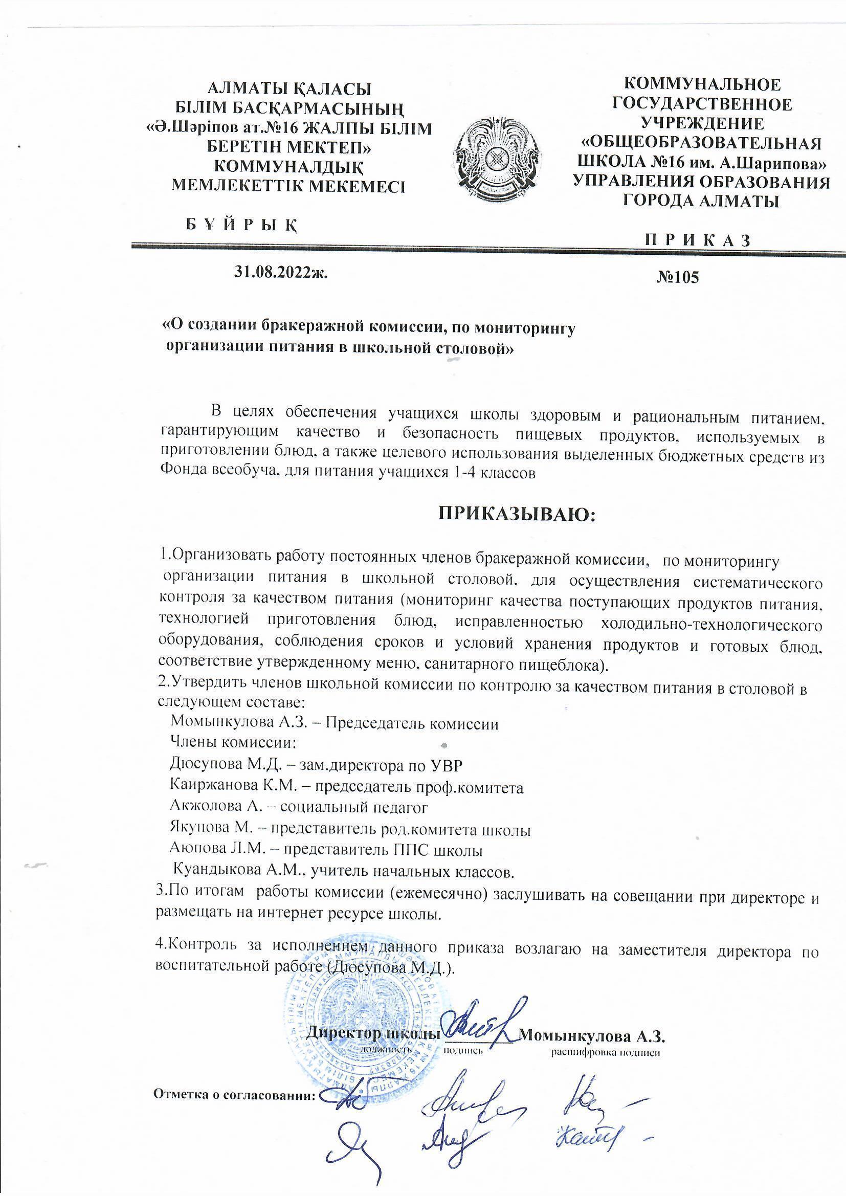 31 август 2022 0 1 2 3 4 5 Приказ о создании бракеражной комиссии, по мониторингу организации питания в школьной столовой. Осы беттің QR-коды:QR-код этой страницы: